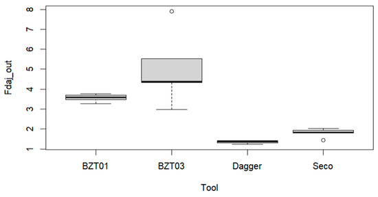 Following the previous analysis, it was important to understand which tool would be more adequate for the drilling operation. If one builds the boxplots of the exit-adjusted delamination factor for each tool, one obtains the representations in Figure 6.