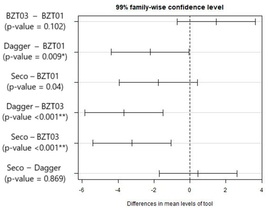 Considering the results in Figure 7, it is possible to conclude that the BZT01 and BZT03 tools do not differ significantly, the same applying to the Dagger and Seco pair and the Seco and BZT01 pair. Supported by these results, we proceeded with further tests considering only the BZT03 and Dagger tools, which is in agreement with what was already observed in Figure 6.