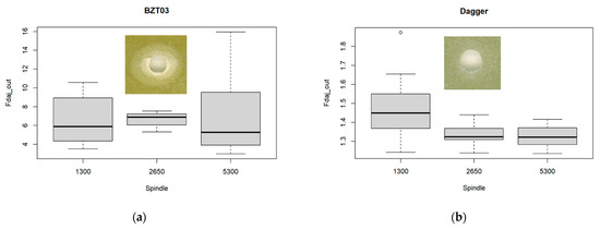 Multiple boxplots for the exit-adjusted delamination factor at the tool’s exit as a function of the spindle speed for the (a) BZT03, and (b) Dagger tools.