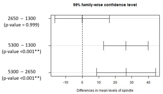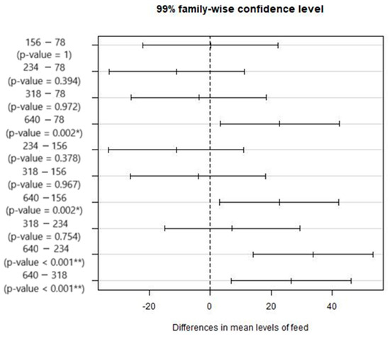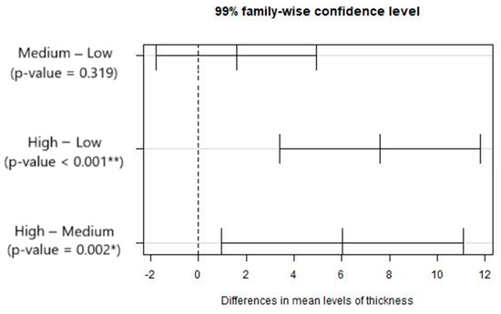 Given that the equality of the mean values has been rejected, it is appropriate to examine the differences between each pair. So, a multiple comparisons test (Tukey test) was performed. The results obtained are presented in Figure 7.