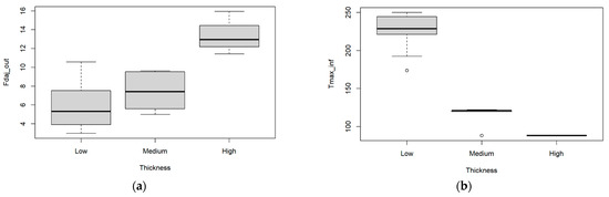 Concerning the information in Table 3, it is relevant to note that the column corresponding to the thickness variable, besides containing the values themselves, also contains the indication of a qualitative classification {low, medium, high}. This is because, for a set of situations where the thickness assumes the values of 2.88 mm, 2.95 mm, and 3 mm, this was not intentional and corresponds to uncertainties in the manufacturing process. So, this set of thicknesses is considered to pertain to the same class of thinner plates.