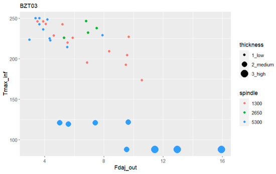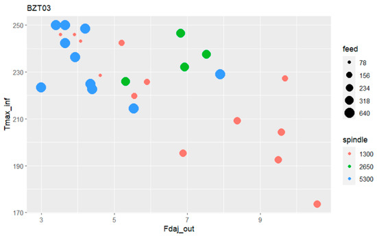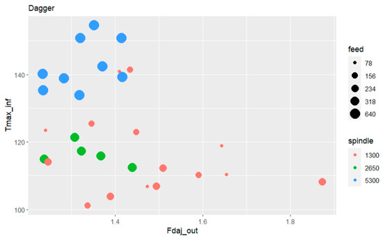 In the first phase, the aim was to determine if there were differences among the four tools used in terms of damage indicators or temperature within the considered range of values (spindle speed of 5300 rpm and feed rate of 640 mm/min). This initial case allowed to identify high correlations in the output variable values at the entrance and exit. These values remained similar throughout the tests, which led us to focus on the exit-adjusted delamination factor, the variable Fdaj_out, for damage analysis. Furthermore, based on the results obtained, it was decided to continue the study using only the BZT03 and the Dagger tools, as they represent two very different performances in terms of damage.