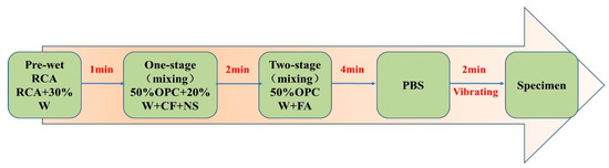 To obtain RAC with uniformly dispersed NS, NS should be effectively dispersed before preparing CF-/NS-reinforced RAC. The weighed NS was mixed with water in a beaker, which was dispersed by an HN-500 ultrasonic nanomaterial disperser. The mixing procedure for preparing RAC was illustrated in Figure 2. The mixtures of RAC were poured into molds with a side length of 100 mm and compacted on a vibrating table. Subsequently, the RAC specimens were placed in a curing room with a relative humidity of >95% and a temperature of 20 ± 2 °C. The RAC specimens were demolded after 1 d and then cured in a standard curing environment (20 ± 2 °C and relative humidity of 98%) until the day of testing.