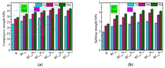 Compressive and splitting strength of RAC with CFs and NS. (a) Compressive strength; (b) splitting strength.