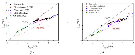 Comparison of experimental and predicted values. (a) ACI Committee318; (b) Chinese code.