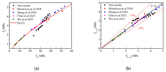 Equation (6) was used to fit the relationship between the splitting tensile strength and compressive strength of the experimental and available literature results of RAC samples (Figure 5a). Coefficients α and β and the correlation coefficient (R2) could be calculated via nonlinear regression analysis, and they were 0.25, 0.75, and 0.92, respectively. Thus, the relationship between the splitting tensile strength and compressive strength of RAC samples with CFs and NS could be displayed as in Equation (7):