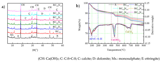 In order to quantitatively analyze the effect of the CFs and NS on the thermal decompositions of cement-based hydration products, the TG and derivative thermogravimetric (DTG) curves of RAC paste at 28 d were tested and are displayed in Figure 6b. It was clear that there were three apparent heat absorption peaks at 50~200 °C, 400~500 °C, and 600~750 °C, which corresponded to (I) the evaporation of water molecules and dehydration of Aft or C-S-H gel, (II) the decomposition of CH, and (III) the decomposition of produced and residual CaCO3, respectively. From the changing trends, the addition of CF had little impact on the mass loss at stages I, II, and III, implying that the CFs did not participate in the hydration reaction of cement. Compared with RC0.6, the RAC pastes containing different NS contents had a relatively higher mass loss at stage I, significantly decreased mass loss at stage II, and a small difference in the mass loss at stage III. Additionally, the increasing content of NS contributed an obvious impact on the mass loss at stages I and II of the RAC pastes. These results illustrated that the inclusion of NS could promote more occurrences of hydration reactions, resulting in the formation of more C-(A)-S-H gels and less CH.