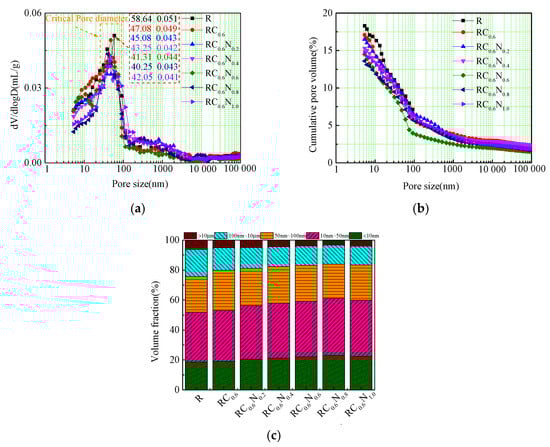 Figure 8 displays the pore size distribution curves, cumulative porosity variation curves, and pore proportion distribution curves of the CF-/NS-reinforced RAC. The critical pore diameter was an important parameter for evaluating the concrete pore characteristics, which corresponded to the highest mercury intrusion rate per pore diameter change. As illustrated in Figure 8, the critical pore diameter and cumulative porosity of RC0.6 were 47.08 nm and 17.39%, respectively, close to those of R (48.06 nm and 18.04%). The results indicated that the addition of CFs had an insignificant optimization effect on decreasing the critical pore diameter and cumulative porosity. However, the compressive strength and splitting tensile strength of RC0.6 were obviously higher than those of RAC, which was not in accordance with the law that the lower porosity and the critical pore diameter of ordinary concrete correspond to high mechanical properties. This was mainly attributed to the fact that the crack inhibition action of the CFs inhibited the generation of micro-bubbles to a certain extent during the hardening process and enhanced the mechanical properties. When the NS and CFs were both added, the NS’s reducing effect on the critical pore diameter and porosity was stronger than the CF optimization effect on the critical pore diameter and porosity. It is worth noting that the critical pore diameter and porosity of RC0.6N0.8 were 12.98% and 40.25 nm, respectively, which decreased by 25.35% and 14.51%, respectively, compared to those of RC0.6. The critical pore diameter and the porosity of RC0.6N1.0 were 14.74% and 42.05 nm, respectively, implying that 1.0 wt% NS slightly decreased the optimization effect on the RAC pore structure. This result was consistent with the mechanical properties of RAC, which was because excessive NC would result in an agglomeration phenomenon and cause the insufficient hydration of cement.