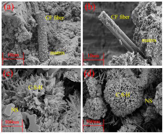 The morphologies of hydration influenced by CFs and NS. (a) The CFs and matrix; (b) the adhered hydration products on CFs; (c) the pores filled by NS and (d) the high-density C–S–H gels.