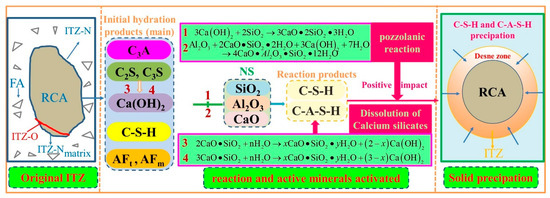 As in the analysis mentioned in Section 3.5, the inhibitory effect on the initiation and expansion of cracks significantly increased when the CFs and NS were both added. The enhancement effect of NS on the RCA not only strengthened the bonding between the matrix and RCA but also enhanced the bonding between the matrix and CFs. This was attributed to the following: (i) NS could not only fill the pores in the ITZ but also easily decreased the migration of relevant ions to the RCA surface, resulting in the “filling effect” and “side wall effect” [36,37,38], which provided numerous nucleation sites and then increased the formation of more products on the RCA surface. (ii) The enhancement effect of NS on the RAC mainly involved four key steps, as illustrated in Figure 10. The pozzolanic reaction between NS, CH, and Al2O3 (see Equations (1) and (2) in Figure 10) could facilitate the formation of C-S-H gel and C-A-S-H gel, which turned capillary pores into gel pores to a significant extent. The proportions of unhydrated C2S and C3S in the cement were increased via the consumption of CH in pozzolanic reactions, which further promoted the generation of more C-S-H gel and improved the entire hydration degree of the cement. More importantly, NS could link low-density C-S-H gels [12] (stacking density of 0.64) to form high-density C-S-H gels by functioning as linking units. Finally, the thin hexagonal plate-like CH crystals could not provide effective mechanical strength for the RAC due to CH crystals being prone to fracture and easily forming microholes under loads. Consequently, the mechanical strength of the RAC was enhanced by the consumption of CH in the pozzolanic reactions of NS. (iii) NS enhanced the interface between the RAC matrix and CFs, which was more conducive to the effect of the CFs on crack suppression and further improved the strain rate effect under loads, as shown in Figure 11. Therefore, when the CFs and NS were both added, they not only inhibited the initiation and expansion of cracks in the RAC matrix but also significantly increased the resistance to crack expansion and the curvature of the crack expansion path in RAC, resulting in a decreased crack penetration ability and improved the mechanical properties. Owing to the aforementioned functions of CFs and NS, the microscopic characteristics and macroscopic mechanical properties of RAC could be obviously enhanced when appropriate levels of CFs and NS are both added.