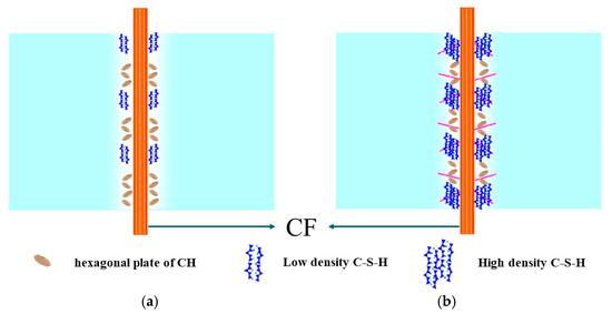 Effect of NS on the interface between CFs and the cement matrix. (a) CF surface with low-density C-S-H; (b) CF surface with high-density C-S-H.