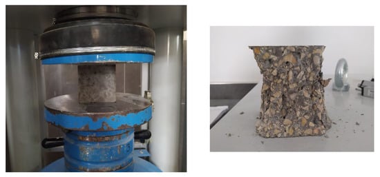 The compressive strength test of the samples was carried out on 100 mm cube samples by EN 12390–3 standard [29]. While preparing the samples, the inner surface of the molds was lubricated before the fresh concrete was placed in the molds. The samples were placed in the lubricated molds. The samples were placed in the middle of the appropriate press machine and tested with a load of 13.5 KN per second. The determination of the compressive strength of the samples and the image of the broken sample are shown in Figure 2.