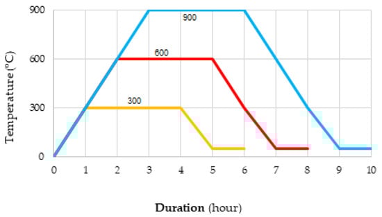 In this study, the resistance of SCC samples to high temperatures was investigated. After curing in water for 28 days, the samples were kept in a rotary air oven at 105°C for 24 h. Then, they were exposed to temperatures of 300, 600, and 900 °C. While determining the temperatures, the previous studies of the authors were taken into account. In all mixtures, the time to reach these temperatures was kept constant at 5 °C/minute and the waiting time at 180 min (Figure 3). The weight change, surface damage, strength, and permeability properties of the samples exposed to the mentioned temperature were determined. The obtained results were compared with the results of the samples not exposed to high temperatures.