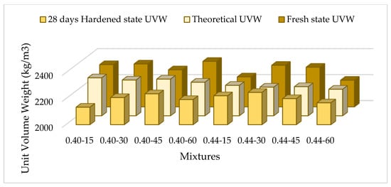 Fresh and hardened state unit weights of the mixtures are shown in Figure 4.
