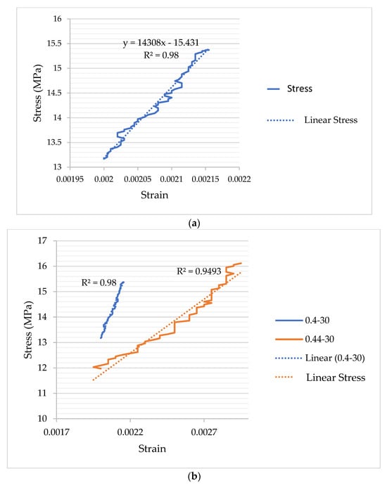 Table 6 displays the load–deformation plots for mixtures with a 0.40 and 0.44% s/b ratio and 30% coarse aggregate content. The modulus of elasticity is a key parameter influencing various concrete properties. Aggregate size distribution plays a significant role in determining the modulus of elasticity. A well-balanced size distribution contributes to a more homogeneous concrete structure, enhanced load distribution, and, consequently, a higher modulus of elasticity. Numerous factors impact the modulus of elasticity in concrete, with the ITZ being one of the most critical. Load-deformation graphs of some selected mixtures are given in Figure 5.