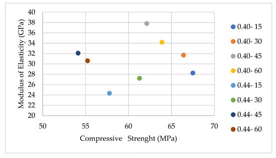 The relationship between the compressive strength and the modulus of elasticity of the mixtures is shown in Figure 6.