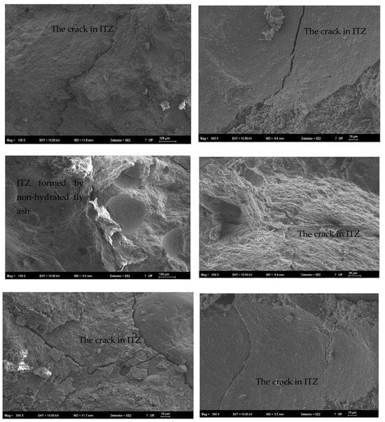 As seen from SEM images, a weak zone is formed in the transition zone of the aggregate paste. It is known that these cracks are affected by parameters such as material incompatibility, curing conditions, and the w/c ratio. It is known that the ITZ is formed more especially in the use of coarse aggregate. The presence of the ITZ negatively affects the strength and durability performance.