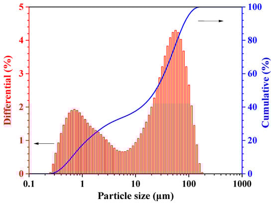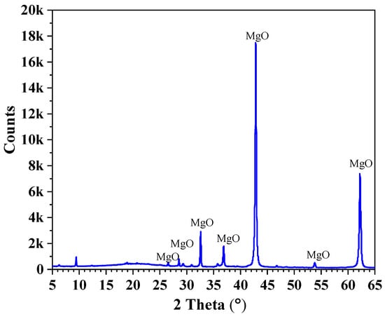 Commercially produced dead-burnt MgO was sourced from Haicheng Magnesite Group Co., Ltd., Haicheng, Liaoning Province, China. Technical-grade NH4H2PO4 and borax, each with a purity greater than 99%, were sourced from Chongqing Sanjiang Chemicals Co., Ltd., Jiaxing, China. The granular NH4H2PO4 was ground to finer powders with required particle size and then passed through a 100-mesh square sieve. The particle size distribution and XRD analysis of the dead-burnt MgO powders are illustrated in Figure 1 and Figure 2, respectively. The chemical composition of dead burnt MgO is detailed in Table 1.