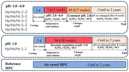 In this study, three inorganic acids—HCl, H2SO4, and H3PO4—were selected as the acid sources. The pH values of these acidic solutions were adjusted to 1.0, 2.0, 3.0, 4.0, 5.0, and 6.0, reflecting the pH range commonly found in degraded sewer pipes due to biological processes and acid rain. Considering that corrosive environments typically exhibited fluctuating rather than constant pH levels, the cement specimens were initially exposed to environments with varying pH conditions, followed by immersion in a stable pH environment to more accurately simulate real-world sulfuric acid corrosion. The variable pH of the three acid solutions ranged from 2.0 to 6.0 during the first 7 days (1 week), after which the pH was maintained at a constant value of 2.0 during for another 49 days (7 weeks), and then it was not changed until for 2 years. In addition, another batch of specimens was exposed to inorganic acids with the dynamic regulation of pH at 1.0 for the first 8 weeks, after which it was continually exposed to acids with pH unchanged for 2 years of immersion. The reference sample was cured in the air for two years with ambient conditions of 21 ± 1 °C and 65 ± 5% relative humidity. The detailed curing and acid corrosion regimes for MPC are shown in Figure 3. The sample nomination is based on the type of corrosive medium and its pH adjustment over time. For instance, “Hp 3-2” designates a sample exposed to phosphoric acid (H3PO4) with an initial pH of 3.0, which was subsequently adjusted to pH 2.0. Additionally, “Hs” represents exposure to H2SO4, while “Hc” indicates exposure to HCl.