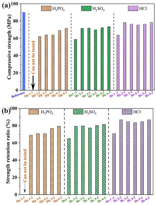 The influence of different inorganic acids on the compressive strength and the corresponding retention ratio of MPC paste with two years of immersion in acid solution is illustrated in Figure 4. The reference sample, which was not exposed to acid corrosion, exhibited the highest compressive strength of 90.19 MPa. For samples exposed to H3PO4, a reduction in strength was observed, particularly at lower pH levels. In contrast, exposure to H2SO4 resulted in a relatively stable compressive strength, while HCl-exposed samples maintained higher strength across all tested pH values. It can be seen that the compressive strength retention ratio increased with the rise in pH, regardless of the source of the inorganic acid. For MPC paste subjected to H3PO4 acid environments, compressive strength retention varied in the range from 68.9% to 79.3%, indicating moderate degradation. In addition, the compressive strength of MPC subjected to H3PO4 erosion with a pH of 1.0 could not be measured due to the intensive acid corrosion reaction, leading to missing edges and corners. MPC subjected to H2SO4 corrosion demonstrated relatively higher strength retention, with retention ratios between 65.1% and 81.4%. MPC subjected to HCl erosion showed the best results, with strength retention in the range of 70.6% to 86.9%, indicating excellent durability in this acid across all pH levels.
