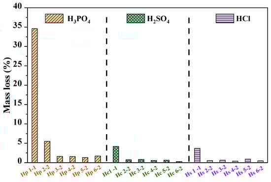 Figure 5 exhibits the mass loss of MPC paste with two years of immersion in different inorganic acid solutions. It can be seen that the mass loss decreased with the rise in pH, regardless of the source of the inorganic acid. For MPC paste exposed to H3PO4 acid environments, the mass loss varied in the range from 1.32% to 34.60%, indicating moderate degradation. The mass loss of MPC cured in H3PO4 solution with pH = 1 was even up to 34.60%, due to the dissolution of hydration products. In addition, this more significant mass loss would extensively decrease the mechanical strength, as evidenced in Figure 4. MPC subjected to H2SO4 corrosion exhibited better acid resistance, with mass loss between 0.29% and 4.19%. MPC subjected to HCl showed the best results, with mass loss in the range from 0.41% to 3.70% across all pH levels. Portland concrete containing sugarcane bagasse ash exhibited mass loss ranges of 5.50% to 9.11% after exposure to 5% H2SO4 and 3.80% to 4.00% after exposure to 5% HCl [38]. Portland cement with metakaolin showed a mass loss of approximately 5.84% after exposure to 5% H2SO4 and about 5.01% after exposure to 5% HNO3 [34]. The sulfuric acid resistance of wood ash-containing concrete, observed under 2% and 5% H2SO4 solutions, exhibited a mass loss ranging from 6.81% to 9.70% [39]. In terms of mass loss under inorganic acid exposure, MPC demonstrated superior acid resistance compared to other cementitious materials.