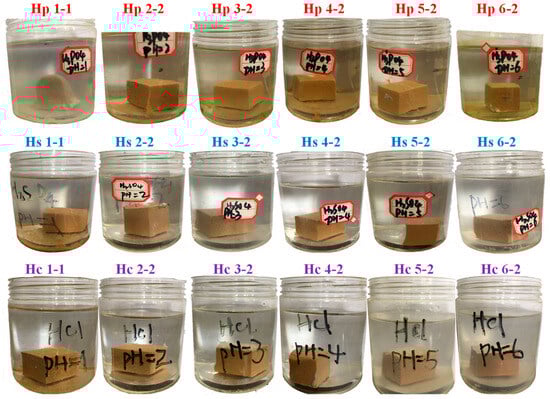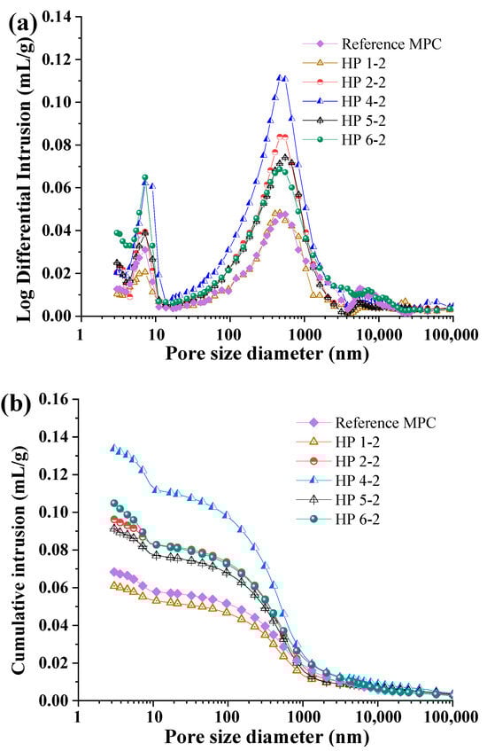 Usually, a severe acidic environment accelerates the dissolution of hydration products, leading to the enlargement of pore structures. Hp 2-2 showed a similar trend, but to a lesser extent, while samples Hp 4-2, Hp 5-2, and Hp 6-2 exhibited a more moderate shift, indicating that higher pH values resulted in less pronounced damage to the pore structure. In contrast, Hp 1-2 displayed a different behavior. While there was a slight increase in the pore volume for diameters below 10 nm, the overall cumulative mercury intrusion was lower compared to the reference group, likely due to the formation of MgHPO4·3H2O, which optimized the pore structure. However, the vigorous reaction between the remaining MgO in the magnesium phosphate cement and H3PO4 led to significant surface spalling and dissolution, ultimately making the samples unsuitable for strength testing.