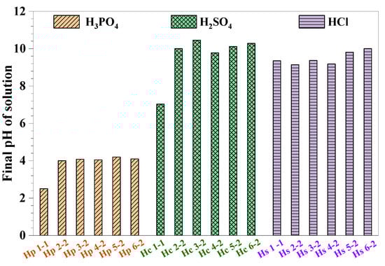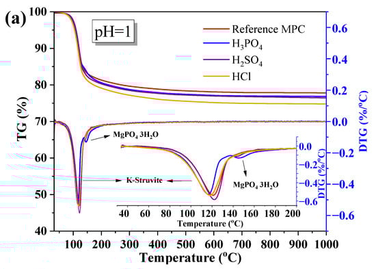 Figure 9 presents the TG-DTG patterns of hardened MPC paste subjected to different inorganic acids at pH values of 1.0 and 2.0. All samples exhibited significant mass loss between 100 and 135 °C, attributed to the dehydration of struvite. In MPC samples exposed to H3PO4 at pH = 1, an additional notable mass loss between 150 and 175 °C corresponded to the dehydration of crystalline hydrate MgHPO4·3H2O, as indicated by pronounced peaks in the DTG curves. This suggested that H3PO4-treated specimens, particularly under highly acidic conditions, informed a higher proportion of phosphatic phases due to reactions between phosphate ions and magnesium. In contrast, MPC samples exposed to H2SO4 and HCl did not exhibit the formation of any dehydrated phases besides struvite. This indicated that sulfuric acid and hydrochloric acid primarily induce the decomposition of struvite without generating additional dehydration products.