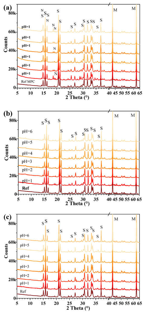 The X-ray diffraction patterns of hardened MPC pasted exposed to different inorganic acids with varying pH levels: (a) exposed to H3PO4, (b) exposed to H2SO4, (c) exposed to HCl. M: periclase (MgO), S: struvite (MgNH4PO4·6H2O), N: newberyite (MgHPO4·3H2O).