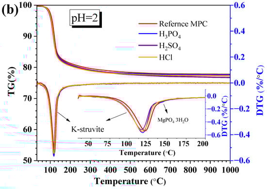 TG-DTG patterns of hardened MPC pasted exposed to different inorganic acids with varying pH levels: (a) pH = 1, (b) pH = 2.