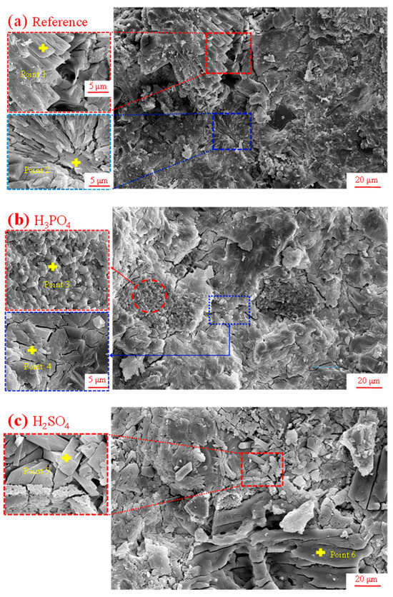 The microstructures of the hardened MPC pastes subjected to different inorganic acids at pH = 2.0 are illustrated in Figure 10. In the reference MPC paste without inorganic acid erosion, it can be observed that the hydration products interlocked with each other to form a dense microstructure, as shown in Figure 10a. This densification was the reason why MPC typically exhibited high mechanical performance. The plate-like and tabular-like/rod-like hydrate was attributed to struvite. Figure 10b presents the microstructure of MPC after 2 years of exposure to H3PO4 solution. The newly formed hydrates with refined and granular morphologies originated from the interactions between MgO and H3PO4 forming MgHPO4·3H2O. Additionally, plate-like and fractured struvite formed in the hardened cement matrix, likely due to mechanical stress or the weakening of chemical bonds caused by acid corrosion. The EDS analysis indicated that the chemical composition of struvite deviated from its ideal stoichiometry (MgNH4PO4·6H2O, with a Mg/N/P molar ratio of 1:1:1) due to a higher phosphorus content, as shown in Table 4.