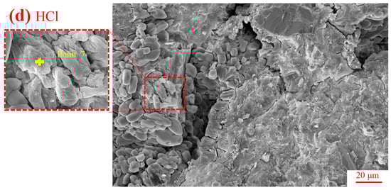 Figure 10d shows the microstructure of MPC paste subjected to HCl erosion at pH = 2. Irregularly shaped plate-like crystals can be observed in the image, with the enlarged yellow box highlighting the detailed characteristics of these plate-like structures. In addition, loosely packed oolitic minerals were also identified, which, according to EDS results, were confirmed to be struvite. This could be attributed to the recrystallization or dissolution–precipitation process of hydration products induced by the acidic environment (HCl, low pH). The EDS analysis of these hydrates revealed a noticeable depletion of N in the struvite structure, as shown in Table 4.