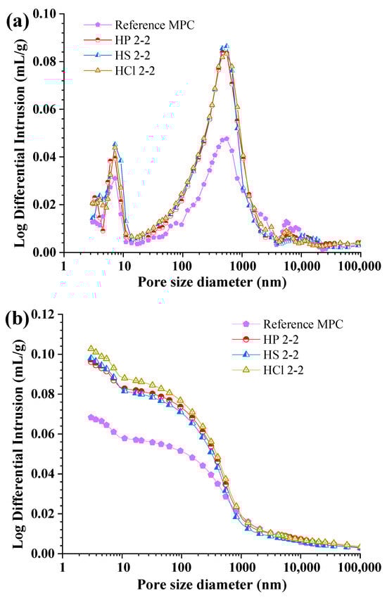 Pore size distributions of MPC subjected to different inorganic acids: (a) log differential intrusion, (b) cumulative intrusion.