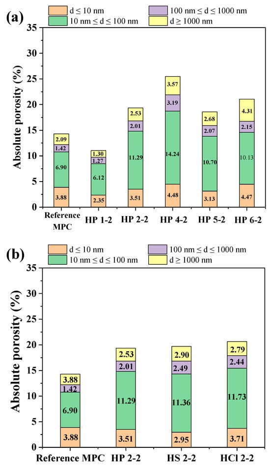Figure 13 illustrates the porosity of hardened MPC at various curing environments. Porosity was categorized by pore size [45]: gel pores (d ≤ 10 nm), transitional pores (10 nm ≤ d ≤ 100 nm), capillary pores (100 nm ≤ d ≤ 1000 nm), and macropores (d ≥ 1000 nm). Figure 13a displays the porosity of hardened MPC paste subjected to H3PO4 with varying pH levels. The reference MPC displayed a balanced distribution with a significant portion of gel and transitional pores, indicating a dense microstructure. Specially, for MPC subjected to H3PO4 with an initial pH value of 1.0 and subsequent pH value of 2.0, the gel pores increased slightly while transitional pores decreased, suggesting an initial refinement of the pore structure, though with a slight rise in macropores. As the pH increased from 2.0 to 6.0, the transitional pores dominated, and both capillary and macropores increased, indicating a shift towards larger pore sizes. Figure 13b displays the porosity of MPC exposed to different inorganic acids at a constant pH value of 2.0. The total porosity of MPC exposed to acid showed the following general trend: the total porosity increased, and the dominated transitional pores increased, as demonstrated by the reduction in compressive strength (Figure 4) and supported by SEM observations (Figure 10b). Notably, in MPC exposed to H3PO4, the detrimental effect of increased porosity on compressive strength surpassed the beneficial impact of MgHPO4·3H2O formation, despite its pore-filling capability. For MPC exposed to H2SO4 and HCl, the products formed from the interactions of MgO with H2SO4 or HCl exhibited relatively high solubility (Ksp), preventing the formation of precipitates. As a result, these products could not contribute to cementitious filling, increasing the total porosity and hindering the development of strength.