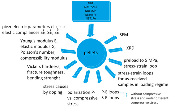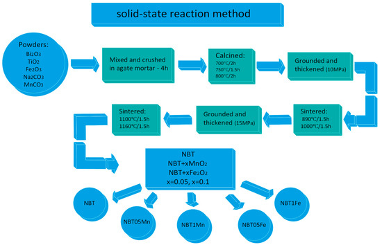 NBT + xMnO2 and NBT + xFe2O3, x = 0.05 and 0.1 (NBT05Mn, NBT1Mn and NBT05Fe, NBT1Fe, respectively), were prepared using the solid-state reaction method on the oxide and carbonate powders Bi2O3 (99.95%, POCH), TiO2 (99.95%, POCH), Fe2O3 (99.95%, POCH), Na2CO3 (99.95%, POCH) and MnCO3 (99.95%, POCH). After weighing, the starting reactants were mixed and crushed in an agate mortar for 4 h. The obtained reagent was calcined under the following conditions: 700 °C/2 h, 750 °C/1.5 h and 800 °C/2 h. After calcination, the material was ground and thickened by pressing under a pressure of 10 MPa and sintered under the following conditions: 890 °C/1.5 h and 1000 °C/1.5 h. Then the material was ground again and pressed under a pressure of 15 MPa. The obtained mixtures were sintered at temperatures of 1100 °C/1.5 h and 1160 °C/1.5 h (Figure 1).