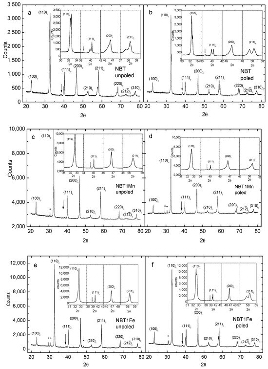 Room-temperature X-ray patterns of NBT (a,b), NBT1Mn (c,d) and NBT1Fe (e,f) ceramics in unpoled and poled states. The “c” subscript corresponds to the cubic phase. “*” shows the secondary phase. The arrow shows the super-lattice reflection of the rhombohedral R3c structure.