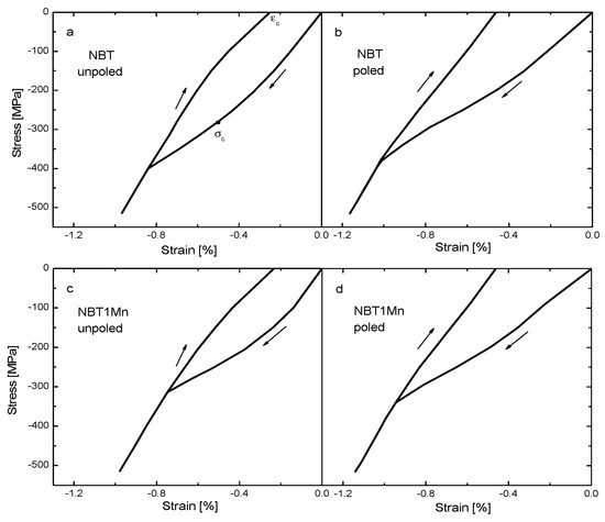 The stress–strain loops of NBT and NBT1Mn in the unpoled and poled states are shown in Figure 5. An initial linear behavior regime following Hooke’s law was observed, indicating a lack of ferroelastic domain reorientation. The appearance of coercive stress (indicated by the inflection point in the loading curve), the onset of strain saturation at higher stress levels and the development of a remnant strain (the strain at zero stress) upon unloading are clearly visible (see also Table 1).