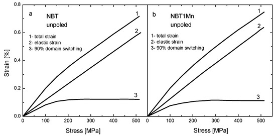 The stress–strain behaviors measured for the as-received samples in the loading regime for the NBT and NBT1Mn ceramics are shown in Figure 6. The curves in this figure are the result of superimposing the stress-induced non-180° domain-switching strain with the elastic displacement strain [24]. To obtain the stress–strain curves corresponding only to domain switching, the elastic contribution should be eliminated by simply subtracting the straight lines, as shown in Figure 2. Although 180° domain rotation causes a change in polarization, no change in shape and very small atomic displacement occur; thus, there is no contribution to strain. For pure NBT, at stresses below about 180 MPa, only small switches occur; this extends up to 400 MPa with coercive stress of ~325 MPa. Exhaustion of domain switching appears at lower stresses, and coercive stress decreases as a result of both the introduction of additives to NBT and the action of the electric field (Figure 6 and Table 1). This is favorable for the application of these materials as a component of actuators.