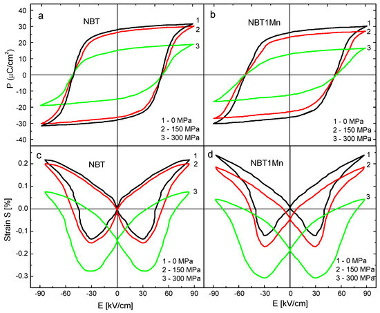 The area of the P-E hysteresis loop represents the unit-volume polarization dissipation energy of the material subjected to one full cycle of electric field loading and is related directly to the number of domains participating in the switching process in an electric field loading cycle. The area under the hysteresis loop is also used for estimation of the energy storage density and energy storage efficiency [25,26]. Progressive thinning, i.e., reduction in the P-E loop area, with increasing stress was observed (Figure 7), which indicated decreases in the dissipation energy and the number of domains contributing to polarization reversal and increases in both the energy storage density and energy storage efficiency. The decrease in the area under the hysteresis loop was more pronounced for the Mn-doped NBT in comparison with the pure NBT. These results can be utilized to further optimize the energy storage parameters for NBT and NBT-doped materials by the application of compressive stress.
