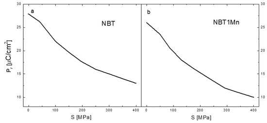 The changes in the remnant polarization, Pr, as a function of compressive stress for pure NBT and NBT1Mn are shown in Figure 8. Significant non-linear reduction in Pr with increasing mechanical stress can be observed for both ceramics. This decrease in the Pr was due to the combined effect of ferroelectric and ferroelastic domain switching, as mentioned above. The decrease in the Pr in the NBT1Mn is more pronounced than in the pure NBT, which means that NBT1Mn is more sensitive to mechanical stress than pure NBT. However, even at a stress of 400 MPa, the remnant polarization is still relatively high for both materials (~13.5 and ~10 μC/cm2 for pure NBT and NBT1Mn, respectively).