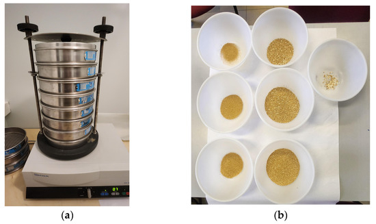 Sieve analysis test: (a) seven calibrated sieves with mesh sizes of 500 µm, 600 µm, 800 µm, 1000 µm, 1600 µm, 2000 µm, and 2500 µm; (b) testing material after separation through the sieves.