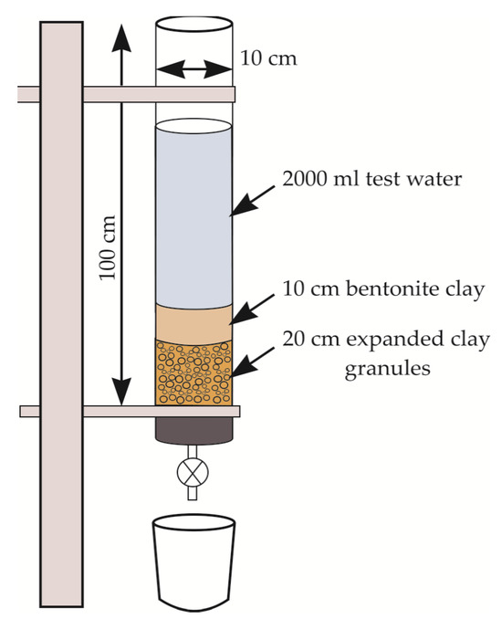 A filtration test was performed using a glass column (height of 100 cm, diameter of 10 cm), recyclable construction waste material (bentonite clay in fractions of 0.8–2.0 mm), expanded clay aggregate, and test water samples (raw stormwater sample and test samples polluted with sodium hypochlorite) (Figure 3). The experiment was carried as follows: In order to determine the water quality indicators of the test samples, a control test was performed. A glass column was filled with 20 cm of expanded clay aggregates as a supporting layer and 10 cm of the recyclable material (bentonite clay) as filter media, topped with 2000 mL of the raw test water samples, and left for 30 min. After 30 min, the test water was collected in a reservoir, and the quality indicators (pH, conductivity, turbidity, and color) were measured. The experiment was repeated three times to obtain reliable results.