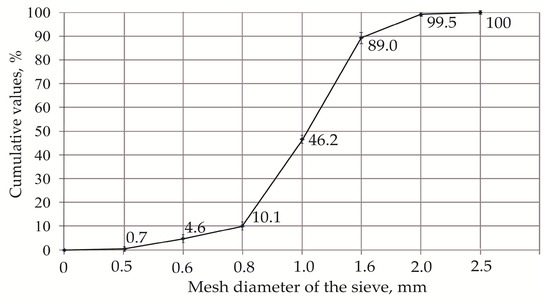 The obtained results were used to draw a particle size distribution curve for the tested material grains. After the sieves were analyzed, four samples were selected (0.8–2.0 mm).