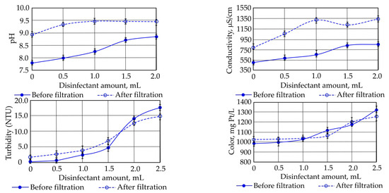 Filtration test. Samples of the initial stormwater were used for a control test to measure the main stormwater indicators (pH, conductivity, turbidity, and color). The obtained results were as follows: pH—8.12; conductivity—2.2 µS/cm; turbidity—0.061 NTU; and color—1.042 AV. A filtration test was conducted using 20 cm of expanded clay aggregate as the supporting layer (with a fraction size of 8.0–11.0 mm) and 10 cm of bentonite clay as the filtration layer (with a fraction size of 0.8–2.0 mm). The solution was prepared by mixing the stormwater samples with different concentrations of sodium hypochlorite (250 ppm, 500 ppm, 750 ppm, and 1000 ppm). Different concentrations of sodium hypochlorite were used to evaluate how disinfection impacts the stormwater indicators. The control test showed that the filtration of the stormwater samples using bentonite clay changed the values of the stormwater indicators. The obtained pH value of the initial stormwater sample was 8.12 before filtration and 9.77 after filtration. The conductivity of the test sample was detected as 2.2 µS/cm before filtration and 129.3 µS/cm after filtration. The low value of the initial sample (2.2 µS/cm) indicates that the water was not contaminated or only slightly contaminated. The significant increase in the conductivity after filtration could be because, during the filtration process, the bentonite clay released some substances that dissolve in water, raising its conductivity. The turbidity and color values changed slightly: the turbidity increased from 1.04 to 1.14 NTU, and the color changed from 0.06 to 0.14 AV. It can be concluded that some bentonite particles were washed into the water and caused the changes in the turbidity and color. Figure 8 presents the changes in the stormwater indicators depending on the amount of disinfectant. The pH value increased after filtration to about 9.0 and remained stable even with increases in the amount of sodium hypochlorite. It can be concluded that the sodium hypochlorite affected the water chemical composition, which may be related to the reactions between the disinfectant and water components. After filtration, the pH was higher and more stable because filtration can remove or neutralize certain substances, leaving a more alkaline water residue. This indicates that the filtration process effectively stabilized the pH even with higher amounts of disinfectant. The conductivity before and after filtration changed slightly. The increases depended on the disinfectant’s concentration, and it may have also been affected by the contact of the solutions with the bentonite clay.