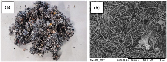 Leather and textile mixture waste materials: a photo (a) and SEM microphotograph (b).