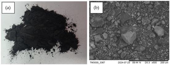 Carbonised material produced by the pyrolysis of waste leather–textile mixtures: a photo (a) and a SEM microphotograph (b).