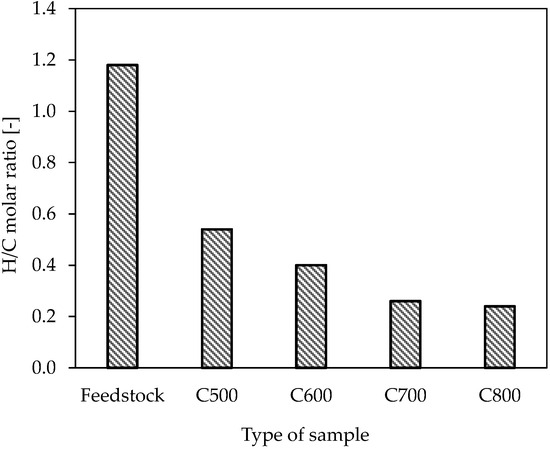 The H/C molar ratio in the waste leather–textile mixtures and the resultant carbonised materials are shown in Figure 3. A reduction in the H/C molar ratio with increasing pyrolysis temperature may indicate the dehydration, polymerisation and volatilisation of certain organic structures. Unfortunately, the expected correlation between the O/C molar ratio and the pyrolysis temperature, typical for these phenomena, was not observed [35].