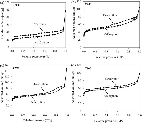 The formation of stable, highly organised structures may restrict the porosity of carbon materials and, thus, the formation of specific surface (SMBET) [31]. Accordingly, the growth of pyrolysis temperature impaired structure organisation and thus contributed to greater microporosity and SMBET. The N2 adsorption/desorption isotherms of carbonised materials made by the pyrolysis of waste leather–textile mixtures are shown in Figure 6. A characteristic feature of the obtained isotherms is the occurrence of H4 hysteresis [46]. The adsorption branch in such cases is a composite of types I and II, with a more pronounced uptake at low P/P0 associated with micropore filling. The occurrence of such hysteresis is characteristic of the presence of micropores and a large number of mesopores. The carbonised materials produced include micro- and mesopores, whose percentage fraction depends on temperatures applied to the pyrolysis process. The disappearance of H4 hysteresis with the increasing temperature of pyrolysis confirms that the microporosity of the obtained carbon materials increases (Figure 6).