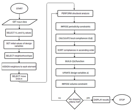 | GET input data SELECT N1 and N2 values SET initial values of design variables SELECT neighborhood type ASSIGN neighbors to each element SELECT move limit m DO UNTIL stopping criteria are met PERFORM structural analysis IMPORT data from structural analysis FOR all elements IMPOSE periodicity constraints CALCULATE local compliances U(di) END FOR SORT compliances in ascending order BUILD C(i) function FOR all elements UPDATE design variables di END FOR IMPOSE volume constraint END DO DISPLAY results |