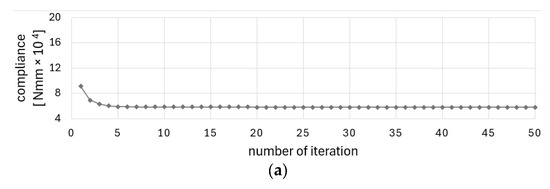 The optimization process started with design variables equal to 0.4 due to the assumed value of the volume fraction. The initial value of the compliance in this case was found to be equal to 9.364 × 108 Nmm. The final compliance reached the 6.575 × 108 Nmm value for the final topology illustrated in Figure 13.