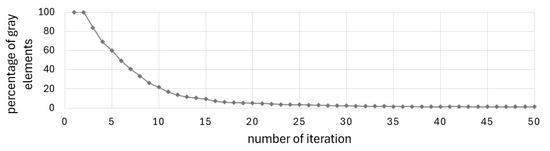 The defined complex problem is solved without gray elements in the solution, as illustrated in Figure 15, showing the change in the percentage of gray elements in each iteration step.